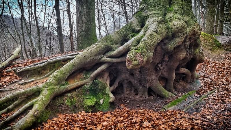 Dann tauchten sie vor uns auf: Die imposanten Sandsteinfelsen der Dörenther Klippen. Man könnte nun dem Hermannsweg weiter folgen oder sich stattdessen auf den etwas anstrengenderen Kletterweg einlassen, der parallel durch die Felsenlandschaft führt und im Gegensatz zum Hauptweg viele schöne Fernblicke zulässt. Auch gestattet die Klettervariante eine gute Sicht auf die markanteste Felsformation: das "Hockende Weib".