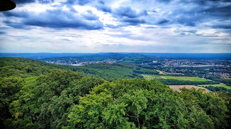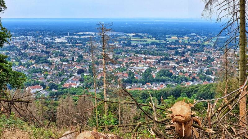 Nicht nur das Höhenprofil, auch die heute recht steinige und schotterreiche Wegbeschaffenheit bleibt anspruchsvoll, so dass man sich, so wie wir es taten, bei "Peter auf´m Berge" durchaus eine weitere Rast gönnen darf. Entsprechend gestärkt, lässt sich anschließend auch der Turm auf der Hünenburg besteigen, von dem wir erstmals einen Blick auf das vor uns liegende Bielefeld werfen konnten. Aber das immer näher kommende Hermannsdenkmal konnten wir am Horizont noch nicht ausmachen.