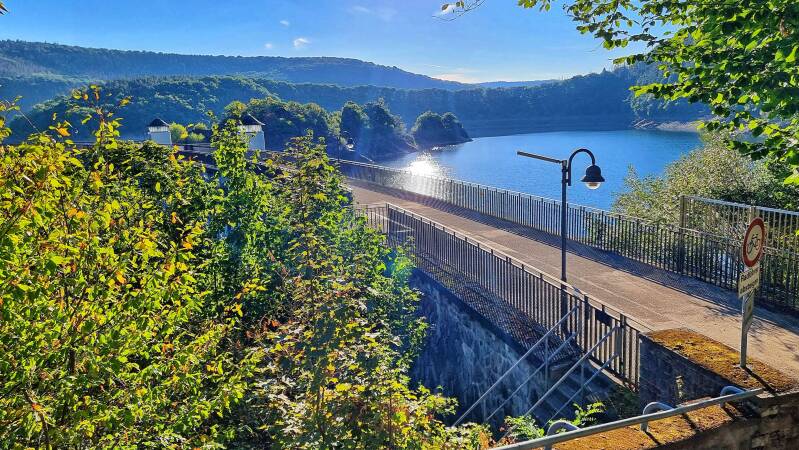 Von wenigen Ausnahmen abgesehen, halten sich die Höhenmeter zumindest auf der direkten Uferrunde in Grenzen. Konstant dagegen bleiben aber die fantastischen Aussichten aus immer neuen Perspektiven auf die vielen bewaldeten Hügel, die sich an fast allen Seiten des Ober-, Rur- und Urftsees erheben und dieser Landschaft im Herzen des Nationalparks Eifel ihr charakteristisch einmaliges Gesicht geben.