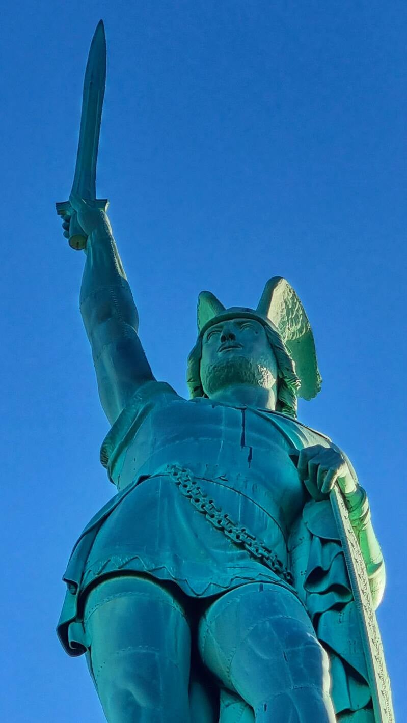Während man im großen Bogen um den Altarstein herum wandert, werden die ersten nennenswerten Höhenmeter spürbar. Kurz darauf folgt der noch steilere Anstieg auf die Grotenburg, wo Arminius, der Cheruskerfürst, in Form des kolossalen Hermannsdenkmals eine Wahnsinns-Aussicht über den Teutoburger Wald genießt. Ein perfekter Ort für eine Rast, zumal wir hier das erste Drittel unserer heutigen Wegstrecke und gleichzeitig auch ihren höchsten Punkt bewältigt hatten.