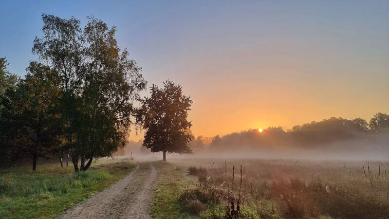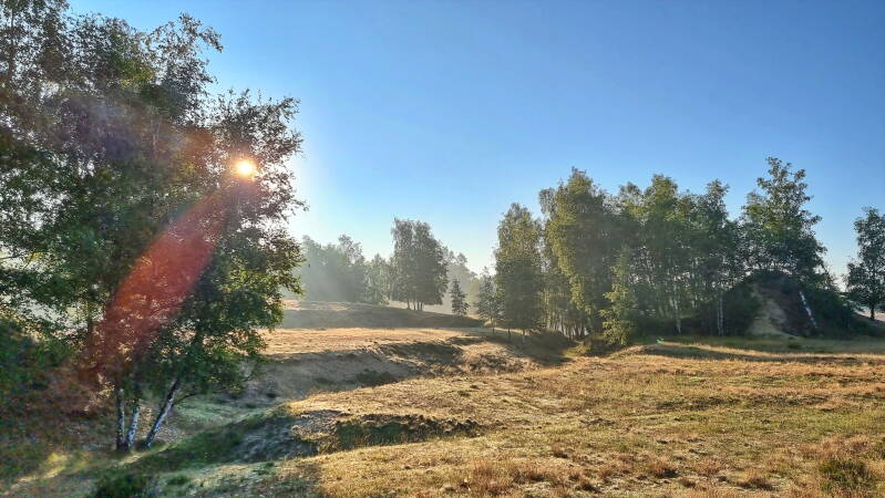 Noch in der Dämmerung startete ich am Wanderparkplatz "Grotenrath" zu einer beeindruckenden Runde, auf der man schon bald einen schönen Aussichtspunkt auf das Heidemoor "Wiggelewak" passiert.
