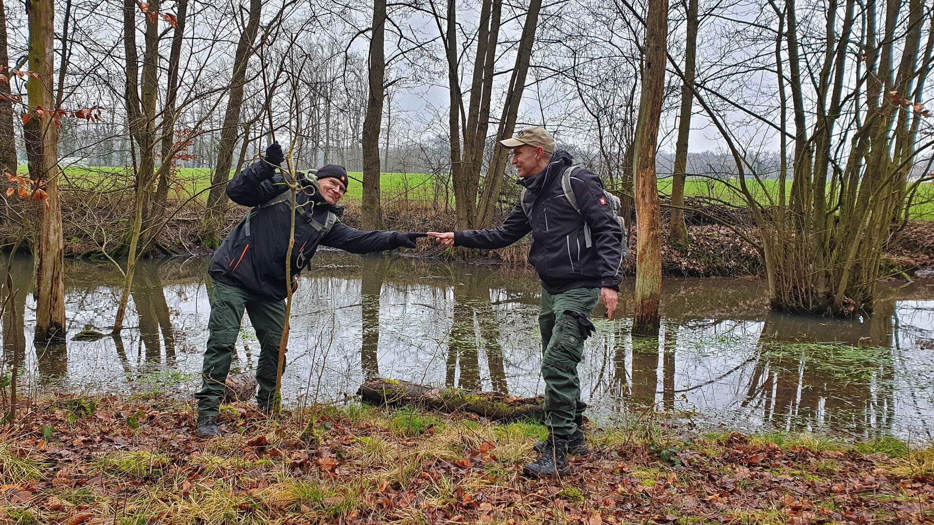 Auf unserer Runde haben wir uns, wo es ging, für möglichst kleine Pfade entschieden, die uns durch viel Bruchholz und an zwei kleinen Teichen und Bächen entlang geführt haben und dabei zeitweise auch mal kaum zu erkennen sind.