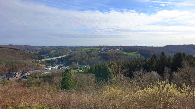Nach einem weiteren, hügeligen Waldabschnitt wird das Örtchen Bleifeld durchquert. Kurz vor Lüderich knickt der Weg dann scharf links ab, erneut in den Wald hinein und an einem kleinen Bächlein entlang, das durch eine künstliche Rinne kurz vor dem Westportal des Lüdericher Tunnels ein Bahngleis überquert.