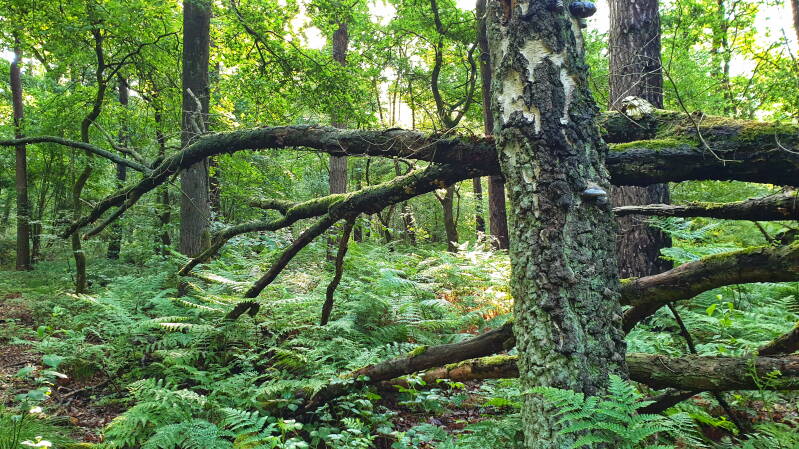Mein erstes Ziel war das kleine Naturschutzgebiet "Jaust-Bruchwald", unmittelbar am Katenkreuz ganz im Osten der Haard gelegen. Hier kann man entweder dem offiziellen Wanderweg folgen (wie ich bereits vor mehreren Jahren einmal), oder stattdessen den versteckt liegenden Alternativpfad erkunden. Ein kleines Abenteuer, das sich ausgesprochen lohnt. Gerade weil der Pfad schon an einigen Stellen zugewachsen und kaum noch erkennbar ist. So muss man sich zeitweise auch durchs Unterholz schlagen.
