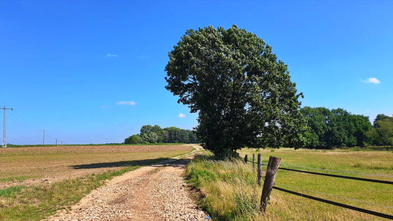 Die ersten Kilometer sind zunächst überwiegend bewaldet und führen durch das Raderveekes und Lüttelforster Bruch. Dabei sind die Flurnamen in dieser Gegend mit "Waschbank", Am neuen Stackenweg" und "Papelter Mühle" wieder einmal recht originell. Nach dem Überqueren der K 29 wird aus dem anfangs breiten Wanderweg dann ein schöner schmaler Pfad.