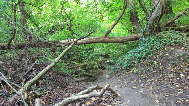 Hier plätschert der kleine Melbbach (oder auch Engelsbach genannt) durch ein urwaldhaftes Waldgebiet mit unheimlich viel Bruch- und Totholz. So hat man, während man einem teils winzigen Pfad folgt, auch häufig über umgefallene Baumstämme zu klettern.