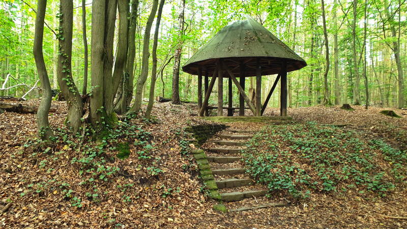 Nach insgesamt 7 km kündigt ein weiteres kleines Wohngebiet an, dass man sich dem nördlichsten Punkt der Route nähert. Schon nach wenigen Minuten taucht man aber wieder in den Wald ein, der zunächst noch ebenso wild wirkt wie das Melbtal. Insgesamt aber kommt man auf der östlichen Seite des Venusbergs besser voran und gelangt nach der historischen Meridianmarke, dem Kaiser-Wilhelm-Denkmal und einem alten, wild zugewachsenen Sportplatz auf einen gut begehbaren Wanderweg, der in südliche Richtung zurück bis zur Waldau führt.