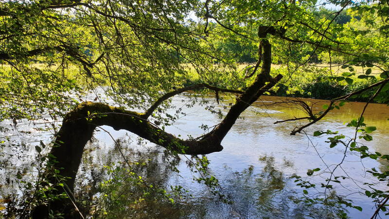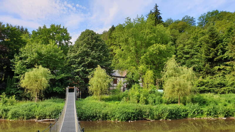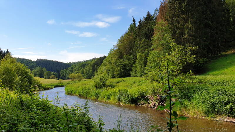 Anschließend geht es wieder ganz hinunter und durch Wildwiesen und Felder weiter an der Nister entlang. Den "Naturpfad Weltende" habe ich hier verlassen, stattdessen folgte ich ein Stück dem Westerwaldsteig. Ich passierte das Dörfchen Flögert, das geschätzt gerade mal aus 10 Häuschen besteht. Nicht weit davon, an der Helmerother Mühle, überquerte ich die Nister erneut.