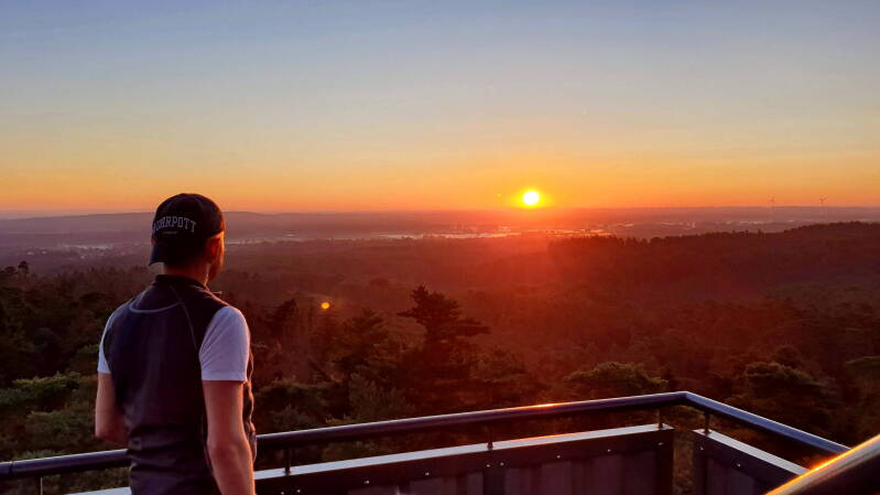 Wenn mitten in der Nacht der Wecker klingelt, mag das nicht jedermanns Sache sein. Aber nur so konnte ich vom Wanderparkplatz bei Mutter Wehner aus rechtzeitig denn Rennberg erreichen. Denn hier, auf der 6. Ebene des Feuerwachturms, war ich heute um Punkt 5:13 Uhr mit der aufgehenden Sonne verabredet. Ja, und pünktlich auf die Minute, trat sie dann auch hinter dem Horizont hervor und lieferte dabei wieder einmal ein beeindruckendes Schauspiel ab, an dem ich mich - wie immer - kaum satt sehen konnte.