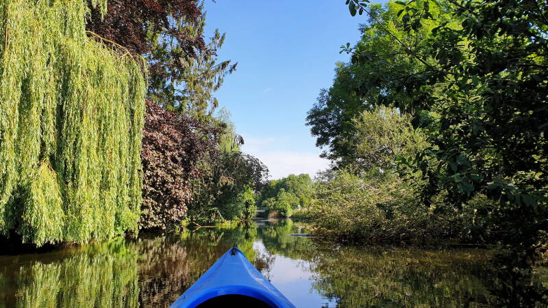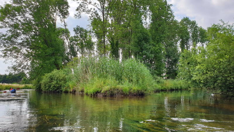Während sich Wiesen und Wälder mit dicht bis ans Ufer stehenden, Schatten spendenden riesigen Bäumen abwechseln, paddelten wir gemütlich weiter. Hin und wieder mussten wir aufpassen, uns nicht in den mächtig wuchernden Wasserpflanzen fest zu fahren. Besonders schön empfanden wir die renaturierten Niersabschnitte zwischen Pont und Geldern.