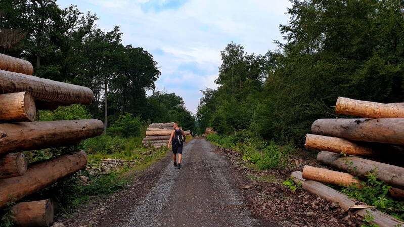 Ein idealer Ausgangspunkt für unsere 20-km-Runde, auf der sich Schotterwege immer wieder mit kleinen verschlungenen Pfaden abwechselten. In den ersten Stunden strahlte sogar noch die Sonne. Am "Potsdamer Platz", wo sich Höhenweg und Neheimer Weg kreuzen, gönnten wir uns nach knapp 5 Kilometern eine erste kleine Rast, die nächste dann etwa 4 Kilometer weiter an einer Schutzhütte am derzeit ausgetrockneten Hasbach.
