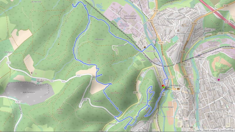 Von Arnsberg aus führte der Weg zunächst an der Ruhr entlang, bevor wir auf der anderen Seite der Bahnlinie das Waldreservat Obereimer betraten. Dort führte unsere Route an vielen der insgesamt 41 Erlebnisstationen vorbei, die hier über die geschichtliche Entwicklung im Stadtteil Alt-Arnsberg informieren. So erkoren wir z. B. den mächtigen Stamm der 400 Jahre alten "Thiergarten-Eiche" als Hintergrund für unser Gruppenfoto.