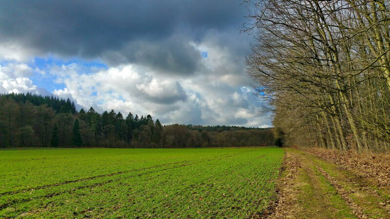 An den "Stellkämpen" wechselte ich dann wieder meine Richtung und strebte nun dem Holzkohlenmeiler zu, der am 1. Mai tranditionsgemäß entzündet werden soll. Hier gönnte ich mir eine längere Rast, bevor es dann dem langen Flaesheimer Meilerweg zurück zu Mutter Wehner entlang ging, und wo meine Wanderung nach 5 Stunden und 21 Kilometern ihren Abschluss fand.