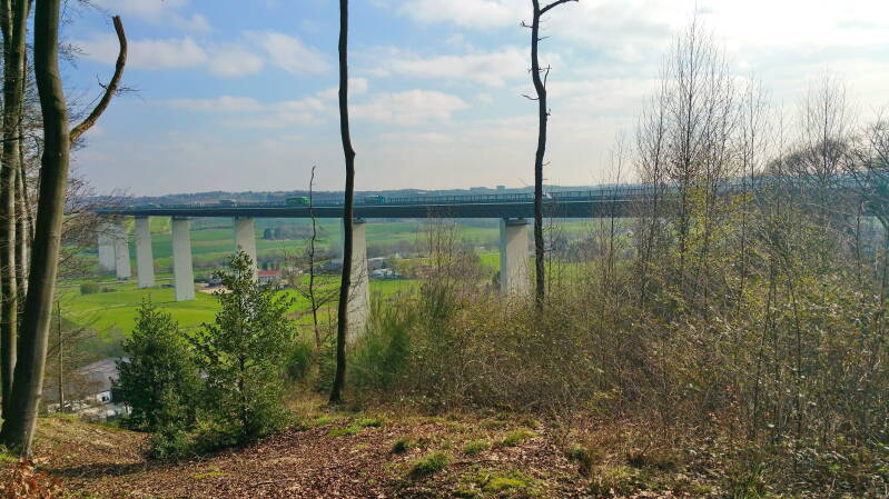 In Mülheim startend führte das erste Teilstück meines Wegs über die Ruhrinsel in das Naturschutzgebiet "Saarn-Mendener Ruhraue" hinein. Später knickte die Route dann fürs Erste von der Ruhr ab, da ich mir auch den Ruhrtalhang am Auberg ansehen wollte. Und das lohnte sich, denn schon bald erreichte ich eine Höhe, von der aus ich eine tolle Sicht in das Tal hinunter hatte. Ich folgte nun einem an der linken Seite steil abfallenden Waldweg bis unter die Ruhrtalbrücke hindurch, wonach ich die "Mintarder Höfe" erreichte und bald darauf an die Ruhr zurückkehrte.