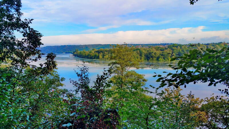 Start- und Zielpunkt meiner Wanderung um den Baldeneysee war der S-Bahnhof Kupferdreh. Zunächst ging ich an der südlichen Seite am Hardenbergufer entlang. Für ein kleines Stück verließ ich zwischendurch den asphaltierten Weg, um einem höher gelegenen Waldpfad zu folgen. Der hatte es in sich. Es erwarteten mich nicht nur viele umgeknickte Baumstämme und riesige Wurzeln, die quer über den Weg lagen, sondern auch sehr enge Abschnitte, an denen es unmittelbar neben dem Weg zudem noch bis zu den Gleisen der Hespertalbahn steil abfiel. Aber da ich schon bald wieder auf das geteerte Hardenbergufer zurückkehren würde, war dieses abenteuerliche Stück trotzdem eine schöne Abwechslung.