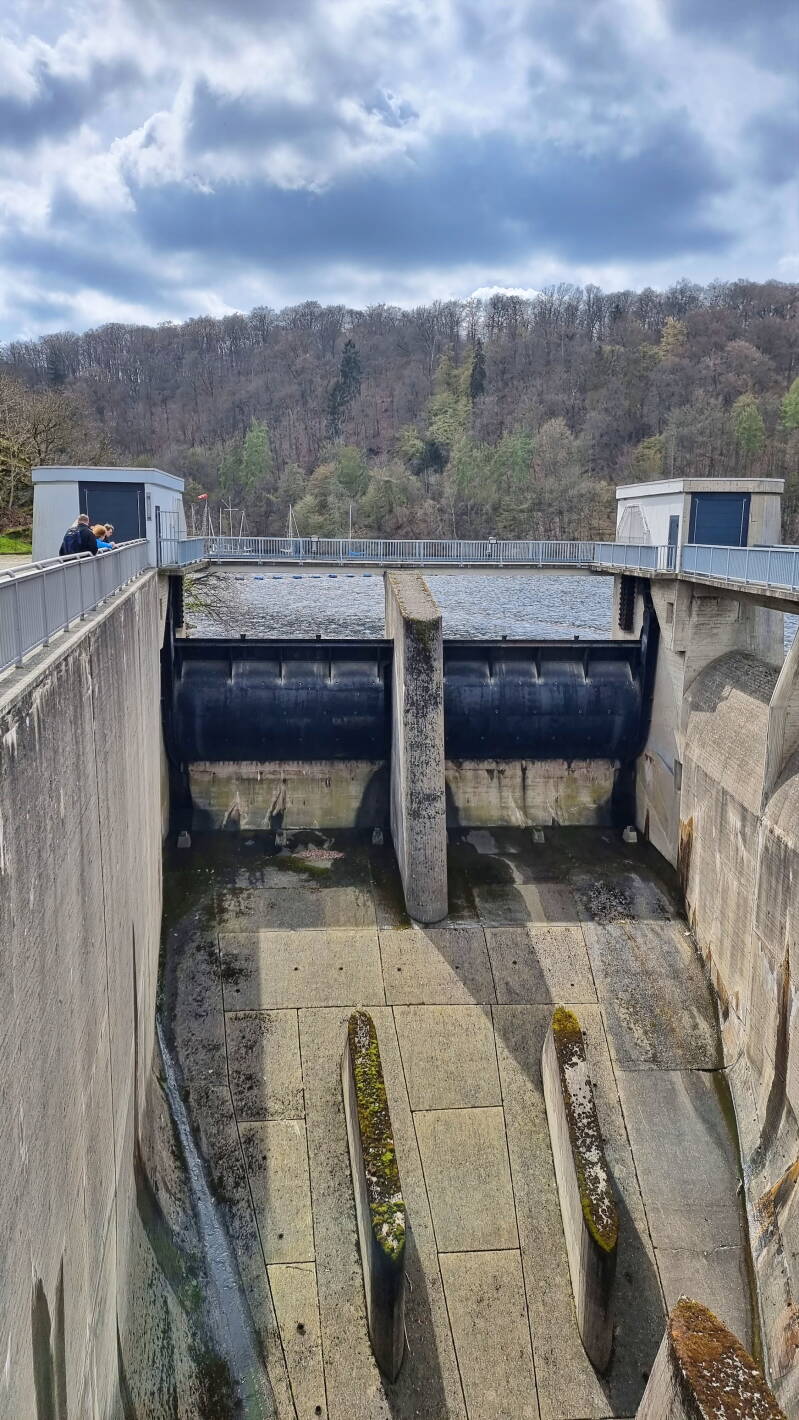 An einer Ferienhaus-Siedlung vorbei, gelangten wir über den anschließenden Aufstieg zur Staumauer von Schwammenauel. Hier ließ sich ein lohnender Blick auf den inzwischen wieder reichlich gefüllten Rursee werfen.