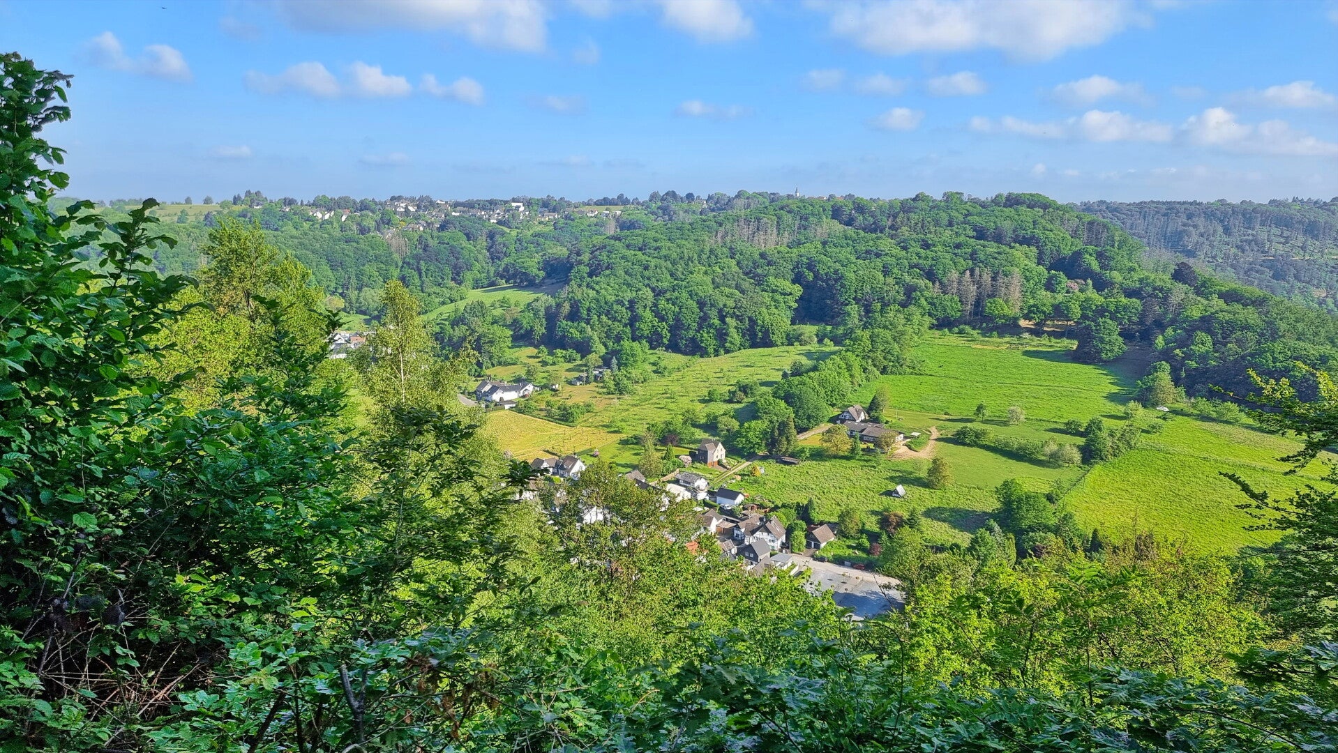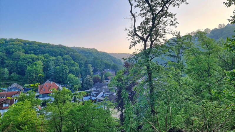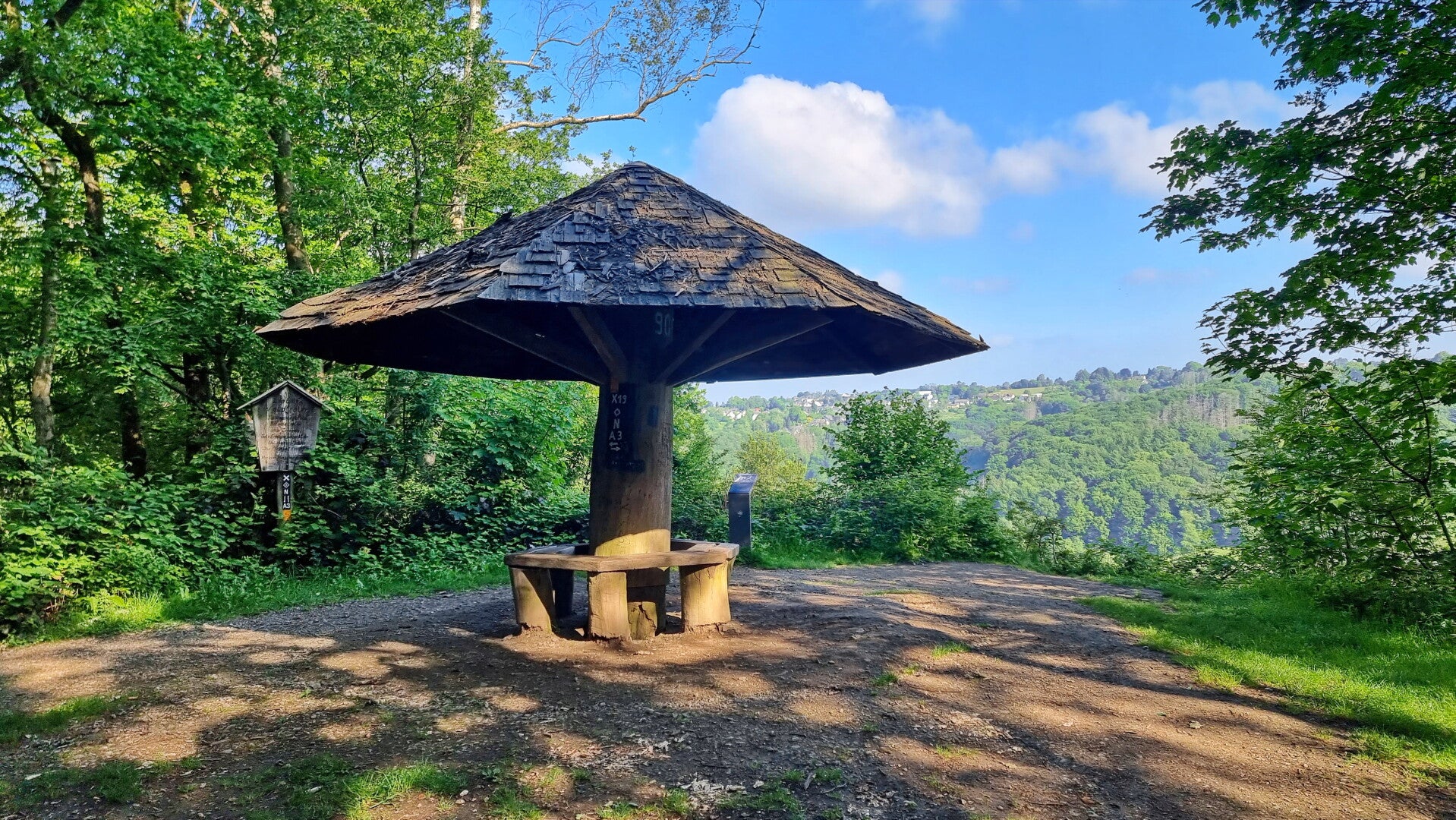 Hat man über Stock und Stein und zahlreichen Windungen schließlich den Unterstand rechts des Weges erreicht, ist das Schlimmste überstanden, und man kann über das Tal der Wupper hinweg die Aussicht auf die dortigen kleinen Orte Obenrüden und Untenrüden genießen. Anschließend führt der Weg wieder abwärts, doch kurz bevor man die Wupper erreicht, wird stattdessen links abgebogen.