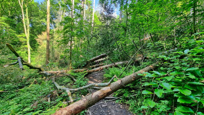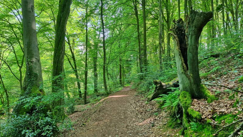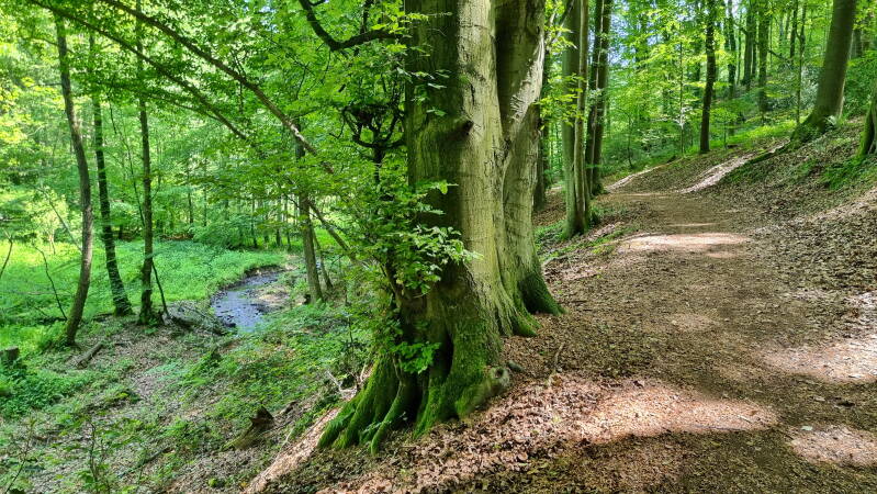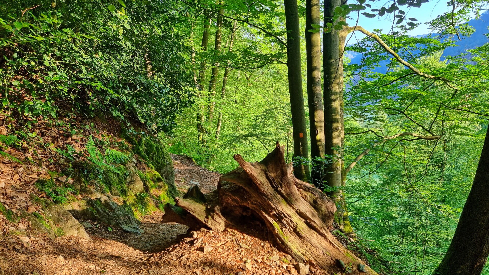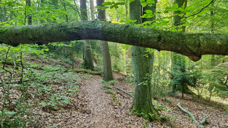 Die richtig schweißtreibenden Abschnitte sind jetzt bewältigt, aber moderates Auf und Ab bleibt bis zum Etappenziel die Regel. Am St. Heriberter Bach entlang führt der Weg nun auf eine freie Hochebene und auf der anderen Seite in das wildbewaldete Weitersbachtal hinein - Kletterpassagen über umgestürzte Baumriesen inklusive. Da ist es auch gut zu verschmerzen, dass die nachfolgenden 1,5 Kilometer zwangsläufig mal an Straßen entlang und über Asphalt führen müssen.