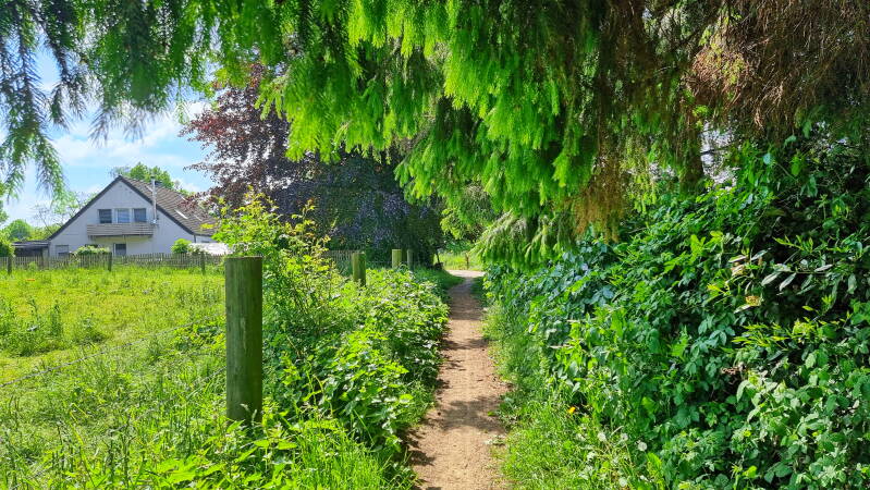 Hinter der Talsperre Diepental und dem kleinen Murbach wird mit Pattscheid ein Wohngebiet durchquert. Auf der anderen Seite der Hauptstraße geht es dann schon nach wenigen Metern einen unscheinbaren Weg hinein. Nun werden sich Wiesenpfade mehrfach mit kleinen Wohnsiedlungen abwechseln, bevor auf einer weiteren Hochebene ein spektakulärer Fernblick zum ersten Mal auch - ganz klein am Horizont - die Silhouette des Kölner Doms sichtbar werden lässt.