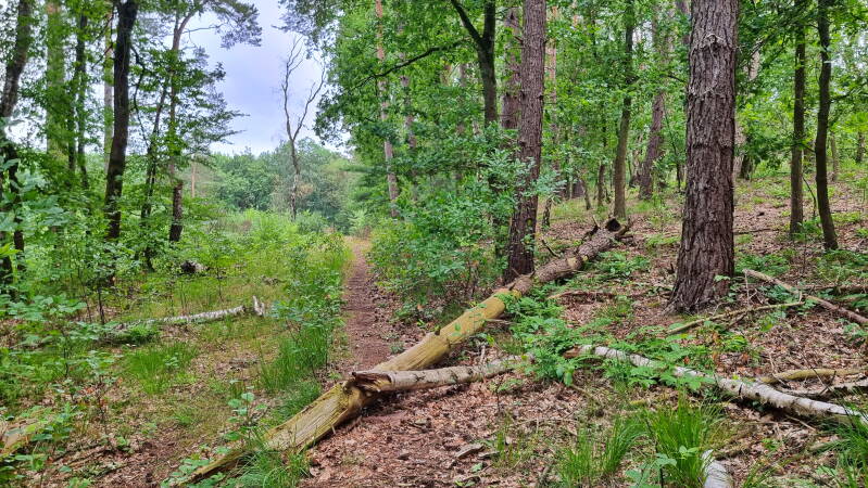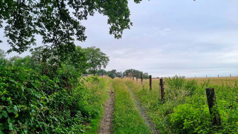 Nachdem man gleich zu Beginn dieser Runde eines der größten Hügelgräber passiert hat, führt der Weg anschließend durch die nördlich des Waldes gelegenen Felder und Wiesen. Und obwohl man sich auf einem Wanderpfad befindet, ist hier kurioser Weise ein Weidezaun zu überklettern. Der kann (wenn man Pech hat) gerade elektrifiziert sein, sollte wegen seiner geringen Höhe für die allermeisten aber kein Problem darstellen. Auch verwöhnt die Route in ihrem weiteren Verlauf immer wieder mit wunderschönen schmalen Pfadabschnitten.