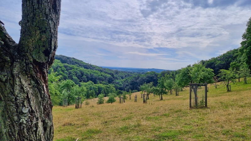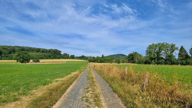 Die folgenden zwei Kilometer führt der Weg nun leider über eine breite "Forstautobahn" bis zum Löwenburger Hof. Über die dortige große Obstwiese hinweg hat man einen tollen Panoramablick in die Ferne, von denen auch diese Etappe noch einige mehr bereit hält.