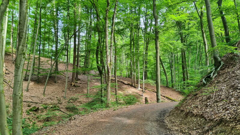 Der Löwenburger Hof markiert dann auch den Punkt, ab dem es mit der Einsamkeit schlagartig vorbei ist (zumindest, wenn man sich von hier aus in westliche Richtung weiterbewegt). Quasi als Entschädigung dafür knickt der Bergische Weg aber schon bald von dem breiten Forstweg ab und führt auf einem herrlichen Hangpfad über den 329 Meter hohen "Ölender" und den "Kleinen Breiberg" (288 Meter).