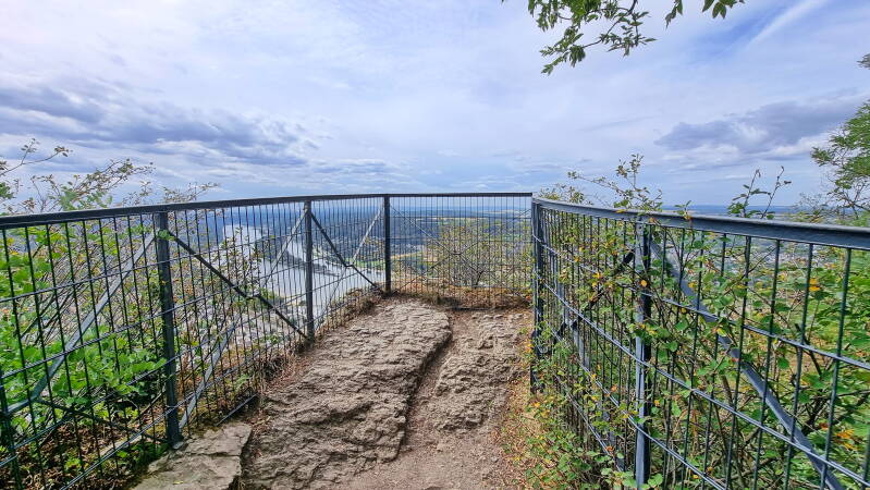 Der beginnt mit einem anfangs noch moderat ansteigenden Asphaltweg und führt mit dem Ulanendenkmal zunächst zu einem Aussichtspunkt, von dem man einen ersten tollen Blick auf den Rhein erhält. Hier setzt dann ein steiler Bergpfad ein, der es noch einmal so richtig krachen lässt und letztmalig ein gehöriges Maß an Kondition abverlangt. Hoch und höher windet er sich, schmal, steil, über mehrere Haarnadelkurven, felsige Anstiege und Stufen den Berg hinauf. Bis man die Siegfried-Kanzel erreicht, deren Aussicht einem schier den Atem verschlägt.