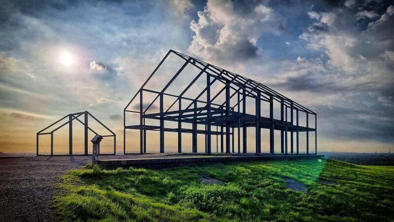 Hier, zwischen der "Alten Dong" und den "Donkschen Benden", treten wieder die typisch Niederrheinischen Felder und Wiesen in Erscheinung - und mit ihnen die Halde "Norddeutschland": Eine bis ins Jahr 2001 aufgeschüttete Bergehalde, auf deren Plateau sich (nach einem gemächlichen Aufstieg) jetzt mit dem "Hallenhaus" eine originelle und weithin sichtbare Landmarke präsentiert. Gleichzeitig ist dies der höchste Punkt des Jubiläumswegs mit tollen Weitblicken in die Umgebung. Bergab geht es auf der anderen Seite über die Himmelstreppe, von der man aber, bevor ihr Fuß erreicht ist, vorzeitig abzweigt.