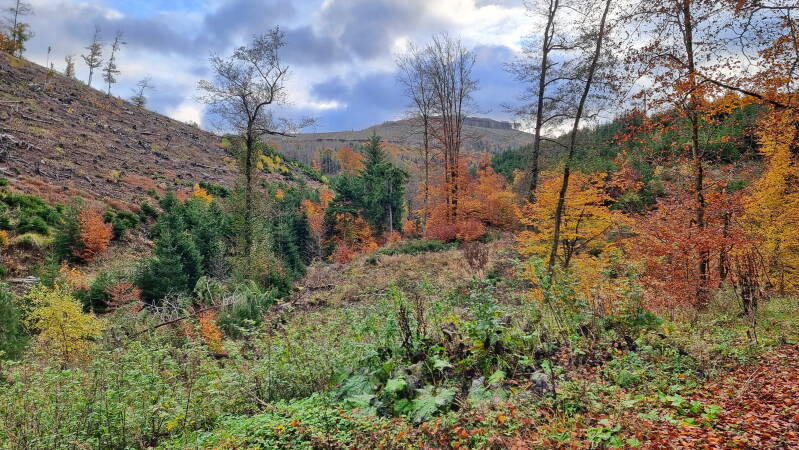 Statt also nun dem Tal der Laupke zu folgen, wanderten wir in östliche Richtung auf den "Teufelsgrund" zu. Nachdem der Hauptweg kurzzeitig bergauf führte, wechselten wir auf einen kleineren Pfad, der uns, nun wieder hangabwärts, zur Bremecke brachte - und damit in ein wild anmutendes Bachtal, das aber auch von großflächigen Kahlschlägen betroffen ist.