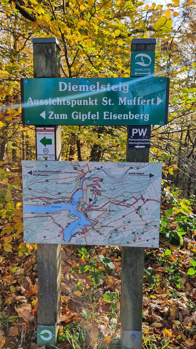 Aber eben nur die Waldroute, denn unser Eingangs erwähntes "Special" sah jetzt noch die Besteigung des 595 Meter hohen Eisenberg vor - samt Besuch seines wahrhaft atemberaubenden Aussichtspunktes. Von dem wir dann nicht nur einen Wahnsinnsblick auf den Diemelsee hatten, sondern auch auf die dahinter liegenden Höhenzüge, über die wir hergekommen waren. Ja, ein anspruchsvoller und höhenmeterreicher Umweg, der weitgehend einem Stück des Diemelsteigs entspricht und sich absolut lohnt.