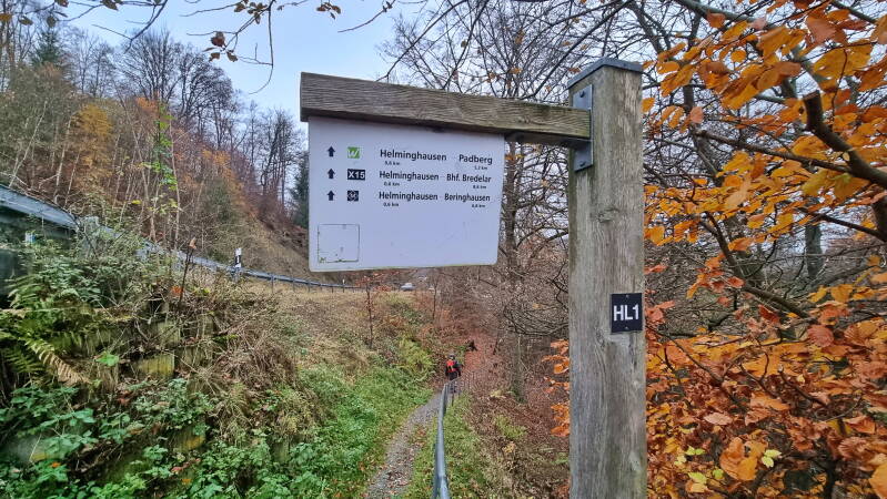 Der Weg dorthin führt anfänglich über einen tollen Waldpfad, der durch das gefallene Herbstlaub zur Zeit bestenfalls erahnt werden kann. Schon sein Einstieg links des Hauptweges ist unauffällig und leicht zu übersehen. Später folgt die Route dem Waldsaum, und das schon deutlich nähergekommene Padberg wird wieder sichtbar. In dessen Ortszentrum wird übrigens nicht nur eine Ladestation für E-Bike-Akkus angeboten, ein Automat hält zusätzlich auch Fahrradschläuche in verschiedenen Größen bereit.