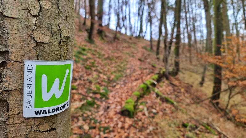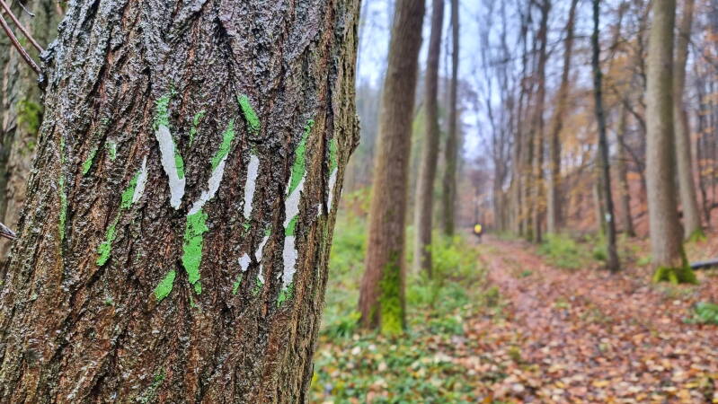 Und die gehören zu dem Eindrucksvollsten, was die gesamte "Waldroute" auf ihren mehr als 260 Kilometern zu bieten hat. Es ist ein Pfad der Superlative. Er windet sich dem Westhang des Eresbergs entlang durch einen Bereich, der stark von Windwürfen gekennzeichnet ist, dadurch aber nur umso wildhafter und ursprünglicher wirkt. Von rechts ragen wiederholt Felsen auf den Weg, während die knorrigen Bäume auf der linken Seite fast schon gänzlich ihr Laub abgeworfen haben und so immer wieder Blicke durch die Äste hinaus in die Weite gestatten.