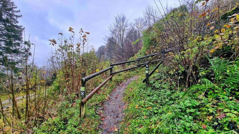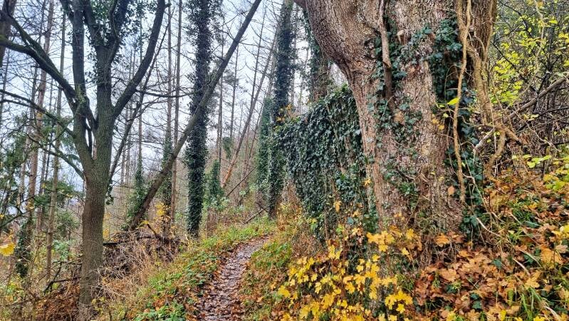 An einer Wegkreuzung wendet sich die Route dann plötzlich erneut nach links ab. Hier, wo sich bis 1940 ein Pferdefriedhof befand, wird der beginnende kleine Pfad jedoch von achtlos abgelagerten Baumstämmen blockiert, die etwas mühsam überklettert werden müssen. Danach führt die Route zwar malerisch, aber dafür einen steilen und rutschigen Waldhang hinunter, an dessen Ende uns ein Wirtschaftsweg aufnahm.