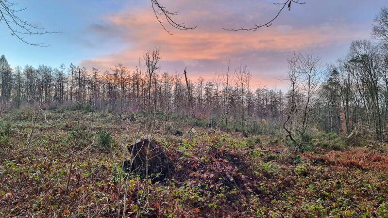 Ab dieser Stelle tut man derzeit übrigens gut daran, entweder mit dem digitalen Track ausgestattet zu sein - oder zumindest das offizielle Faltblatt des Rundwegs mitzuführen. Denn kaum biegt man am Fernmeldeturm links ab, ist man auch schon am vorläufig letzten der (sonst sehr zuverlässigen) violetten Wegzeichen vorbeigelaufen - und das gilt für die nächsten fünf (!) Kilometer. Zwar ist die Route anfangs noch identisch mit dem "Hohe Mark Steig" und führt auch danach weitgehend gerade bis zur L 652 und dem Ketteler Hof hinunter. Aber auch hier fand sich (zumindest heute) kein Hinweis über die weitere Wegführung.