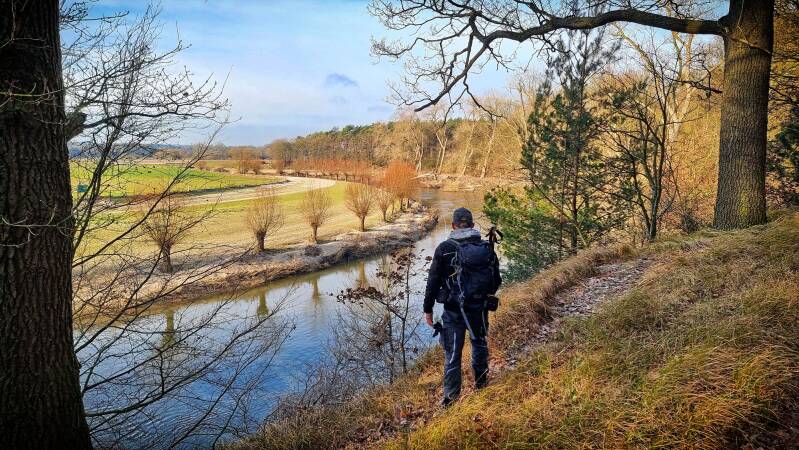 Die (ansonsten recht zuverlässige) Beschilderung hat aber ausgerechnet auf diesem Teilstück ihre Schwächen. So ist es wichtig zu wissen, an der nächsten Abzweigung den links abgehenden kleinen Pfad einzuschlagen. Denn der führt - an einer Steilkante entlang und stellenweise ungesichert - zu einem der schönsten Aussichtspunkte der ganzen Rundtour. Genau dort, wo die von unzähligen Kopfweiden gesäumte Lippe einen ihrer mutmaßlich schönsten und markantesten Bögen beschreibt.