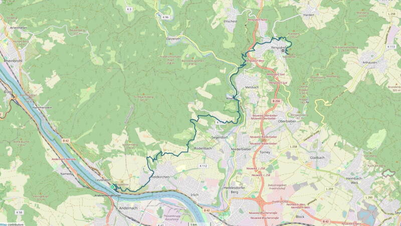 Es ist aber auch eine Etappe der zahlreichen Bachtäler, gerade innerhalb der mehrfach wiederkehrenden kleinen Wälder. Mit dem Kehlbach, Buchbach, Reichelbach und Aubach sind nur einige genannt. Dazwischen öffnen sich auf den Hochwiesen als Kontrast immer wieder Weitsichten in das Neuwieder Becken hinunter, deren umgebene Höhenzüge maßgeblich die Route der heutigen und auch die der kommenden Etappe mitbestimmen. Und trotz seiner zunehmenden Entfernung macht auch der Rhein immer wieder eindrucksvoll auf sich aufmerksam.