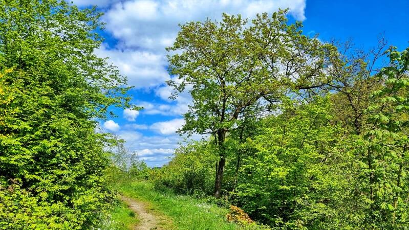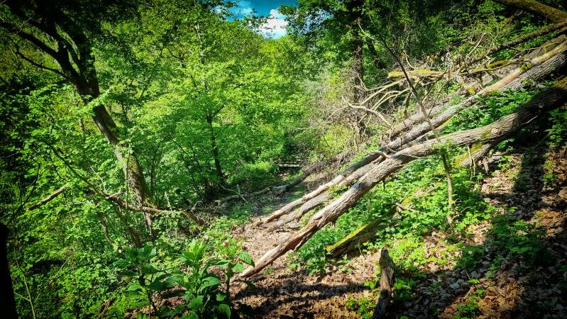 Im Tal, wo man auf einen alten Sauerbrunnen trifft, wird auch der Dinkholer Bach überquert."Dinkholder" steht aber nicht nur für Bach und Tal, sondern umfasst vor allem auch das abenteuerliche und höhenmeterreiche Waldgebiet rund um den Oberen und Unteren "Dinkholderberg". So geht es schon kurz nach der Bachquerung wieder hoch, und auch die Wegbeschaffenheit bleibt durchaus anspruchsvoll. Der Pfad windet sich immer weiter in die Höhe, bis man - zumindest derzeit - von einem riesigen, umgestürzten Baum ausgebremst wird.