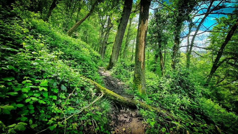 Der Abstieg erfolgt über steiles und schroffes Gestein und ist mit Seilen gesichert, so dass die Passage eigentlich für jedermann machbar sein sollte. Während sich oben noch ein toller Panoramablick auf den Rhein und die Ortschaft Rhens zu seiner anderen Seite bietet, wartet am Fuß des Felsenwegs ein Waldgebiet, in dem der Pfad auch gleich schon wieder ansteigt - und hoch bis auf die "Kerkertser Platte" führt.