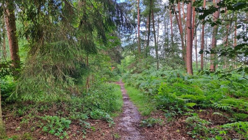 Nach einer Weile verengte sich die Trasse dann aber annähernd wieder zu dem urigen Pfad, wie ich ihn aus früherer Zeit kannte. Er führte uns auch zu jener Wegekreuzung, die unser heutiger Pausenplatz sein sollte und an der ich erst vor fünf Tagen auf meiner jüngsten Erkundungs-Etappe des alten Hohe Mark Steigs vorbeigekommen war: dem "Weißen Kreuz".