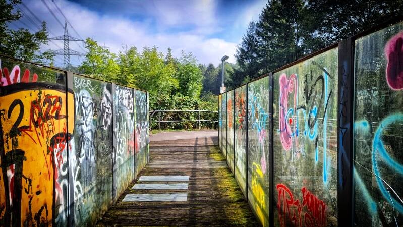 Auf der Singscheider Höhe wartet dann wie zur Belohnung wieder ein Weitblick in die Hügellandschaft, bevor ein weiterer Wechsel aus Waldpfaden und Asphaltwegen ins Deilbachtal hinunter leitet. Über die Hundebrücke geht es auf die andere Seite des Deilbachs und der Bahngleise.