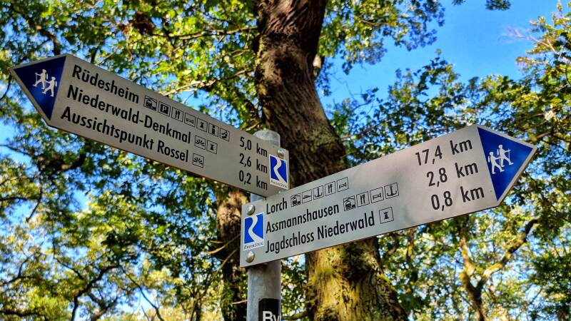 Gleichwohl fanden wir uns - oben ausgestiegen - unversehens auf dem Rheinsteig wieder. Auch Wolf erkannte das blauweiße Logo schnell wieder, nachdem er seinerzeit gemeinsam mit mir die achte Etappe unternahm und hierbei auch die spektakuläre Ruppertsklamm meisterte. Heute strahlte uns das Zeichen erstmals am Niederwaldtempel entgegen, von dem es dann nur wenige Schritte bis zur Germania waren.