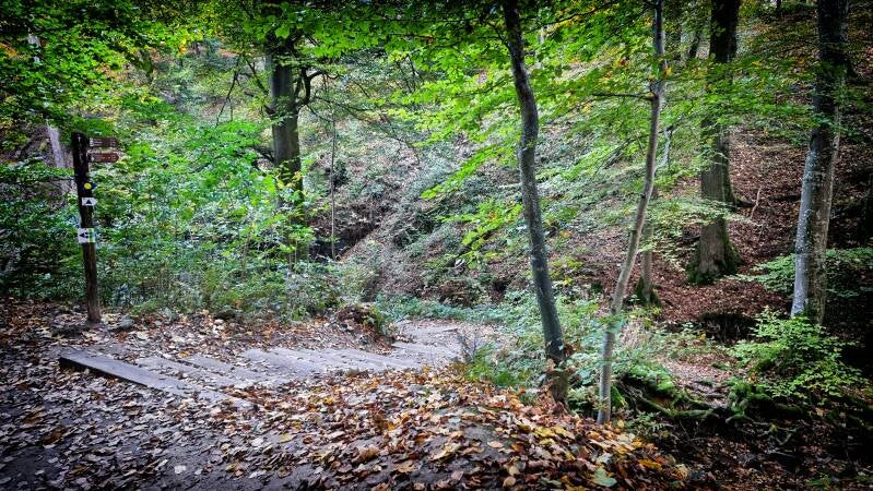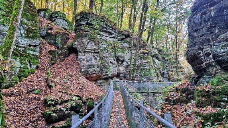 Vom großzügig angelegten Parkplatz "Martbusch" in Berdorf sind es nur wenige Minuten bis ins idyllische Tal des Ruetsbësch hinein. Eine leicht federnde Hängebrücke hilft hier über einen besonders schroffen Schluchtenabschnitt hinweg.