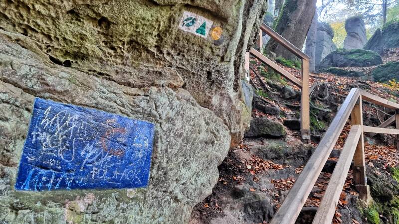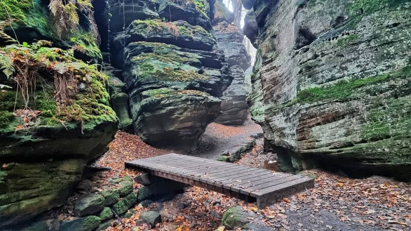 Am Fuß der nachfolgenden Treppe türmen sich dann gleich links und rechts bizarre Felswände auf, bevor man sich mit dem Adlerhorst schon bald der ersten wirklichen Herausforderung nähert. Leitern, vor allem aber viele unebene und steinerne Stufen erschließen die schmalen Klüfte und Höhlen dieser außergewöhnlichen Felsformation. Und die "Raiberhiel" - die Räuberhöhle - ist nur eines ihrer Highlights.