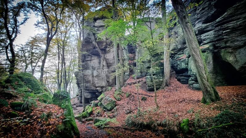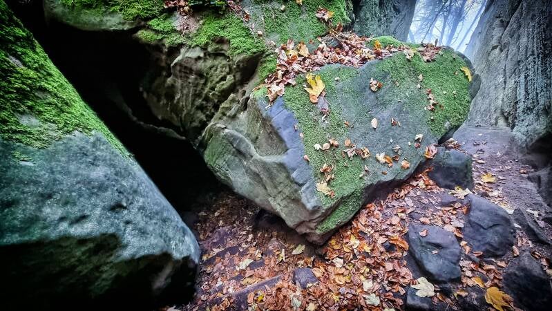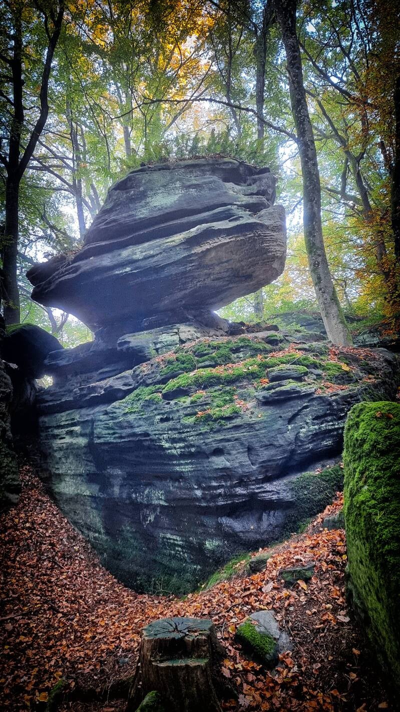 Die engen Felspassagen befanden sich nun hinter uns, doch der folgende Waldweg bleibt kaum weniger spannend. Immer wieder prägen gewaltige Felsen und Findlinge das Bild, bis wir uns mit einem Mal auf einem schmalen Pfad wiederfanden. Dort wird die Szenerie der Felsenwelt dann - genau so unvermittelt wie sie begann - auch wieder verlassen.
