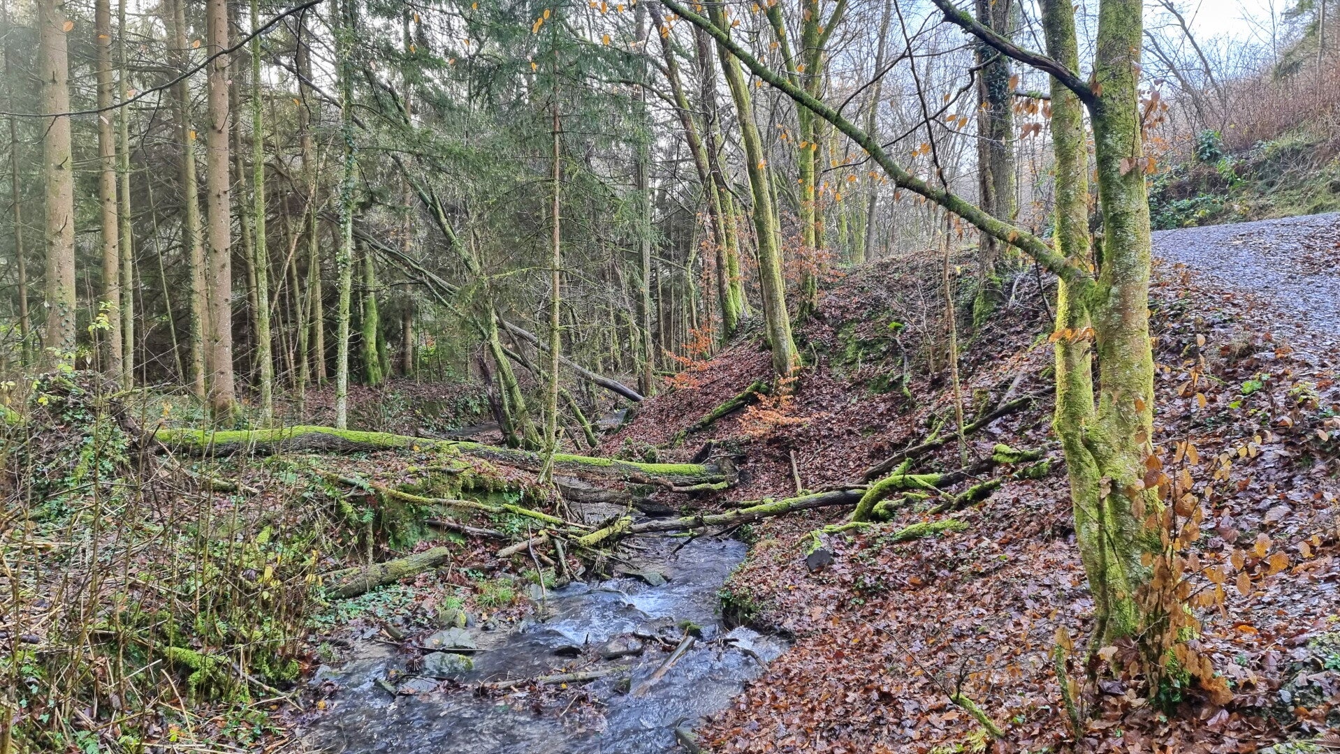 Also: es geht schräg rechts hinab, denn kurz darauf steht erneut ein Wechsel auf die andere Bachseite an. Doch die flussnahen Bereiche haben (gerade jetzt im Herbst und besonders auch nach ausgiebigen Regenfällen) so ihre Tücken. Rechnet daher mit der einen oder anderen Schlammpassage.