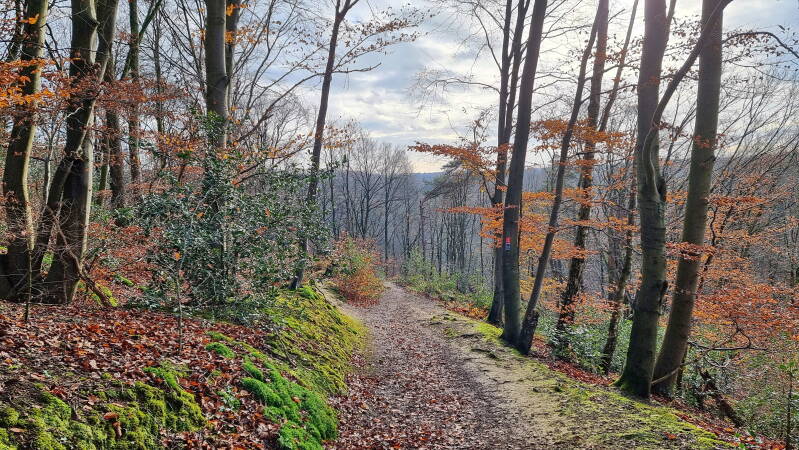 Mit der Rausmühle und der Markusmühle folgen in einigem Abstand zwei weitere Ankerpunkte. Dann verbreitert sich der Weg, weshalb man geneigt ist, den plötzlich rechts hinunter führenden Pfad einfach zu ignorieren. Das aber genau ist die Route, und ausgerechnet hier (!) fehlt die ansonsten sehr zuverlässige Beschilderung.