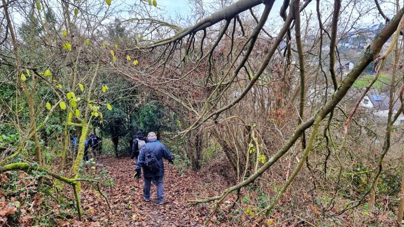Als wir dann (dank des leckeren Glühweins aufgewärmt) weiterwanderten, setzte ein Schneeregen ein, der glücklicher Weise nur kurz anhielt. Über laubbedeckte Hangpfade ging es dann weiter, bis der äußerst steile Abstieg nach Kasbach trotz seiner Stufen eine erhöhte Konzentration verlangt.