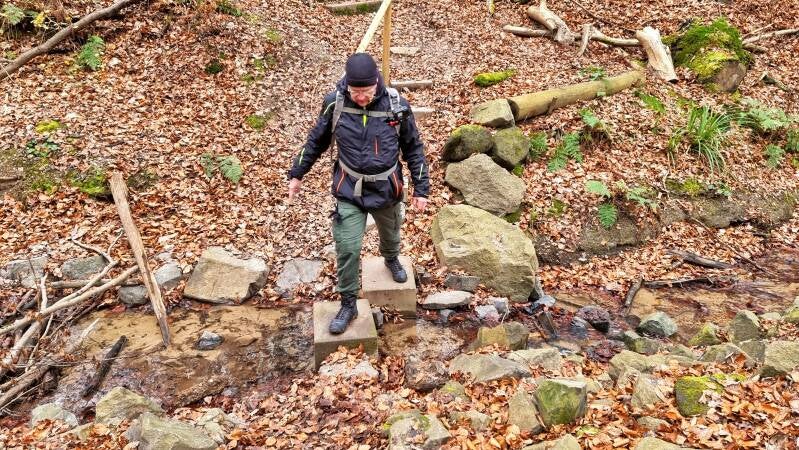 Am Ockenfelser Bach entlang geht es durch das erste der zwei beschaulichen Bachtäler dieser 15 Kilometer langen Rundtour. Und wie schon bei unserer ersten Teilnahme im Jahr 2018, gönnte sich die Gruppe im Ortsteil Ohlenberg auch diesmal eine kulinarisch angereicherte Pause mit von Johann gespendetem Pfirsischlikör und unserem Spekulatius dazu.