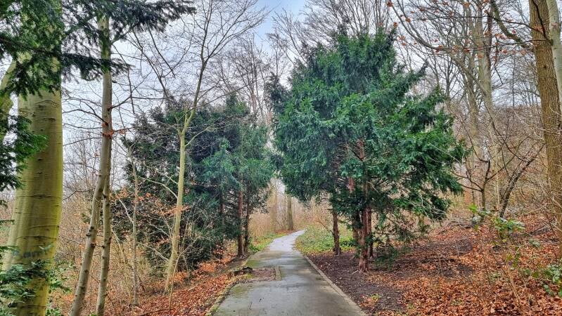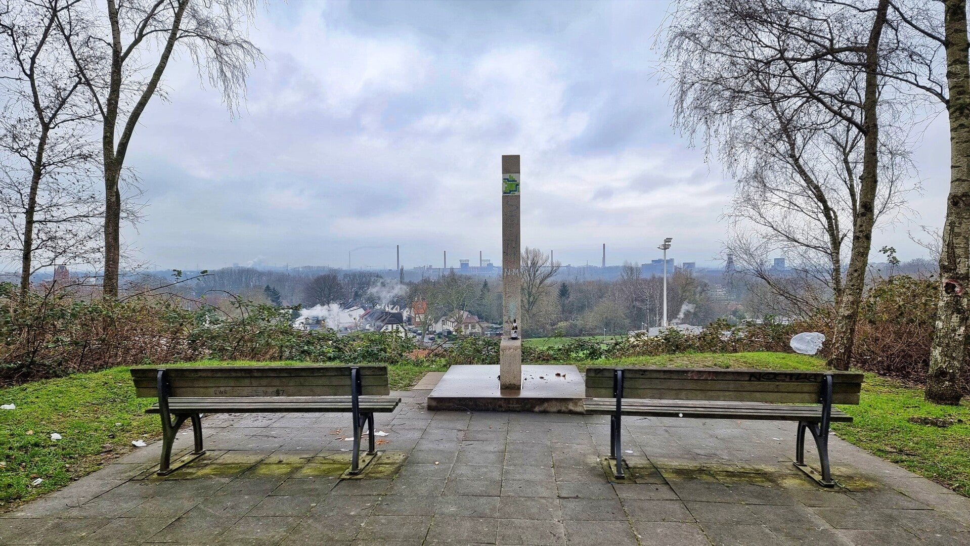 Hier setzt ein Waldweg ein, der die belebte Kreuzung an der Kirche mit dem gerade erst frisch umgestalteten Hallo-Radweg verbindet. Doch weit vorher schon wird dieser Weg zugunsten eines deutlich kleineren Trampelpfads wieder verlassen, der sich recht unübersichtlich durch das Gehölz windet. Dort, wo er auf den "Hallo"-Friedhof mündet, kommt bei Erreichen der Anhöhe dann auch schon die erste Stele ins Blickfeld, von der man eindrucksvoll auf den Ortsteil Katernberg blicken könnte, hätte der heutige Dunst die Sicht nicht eingetrübt.