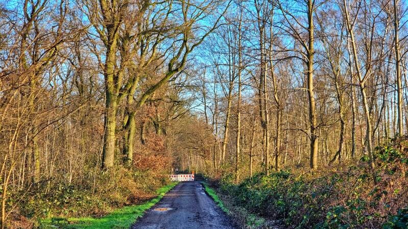 Irgendwann verraten einige Häuser, dass man sich in Repelen befindet. Erst in Eick-West und Eick-Ost geht es für längere Zeit durch ein größeres, aber genauso ruhiges Wohngebiet. Mit dem Einbiegen auf die "Orsoyer Allee" beginnt dann eine fast schnurgerade Passage, die auf drei Kilometern fast vollständig den Baerler Busch durchquert. Während sich dabei kurz auch ein Blick auf das Geleucht der Halde Rheinpreußen ergibt, schimmert das im Sonnenlicht glitzernde Wasser des Waldsees immer wieder mal durch das winterlich kahle Geäst.